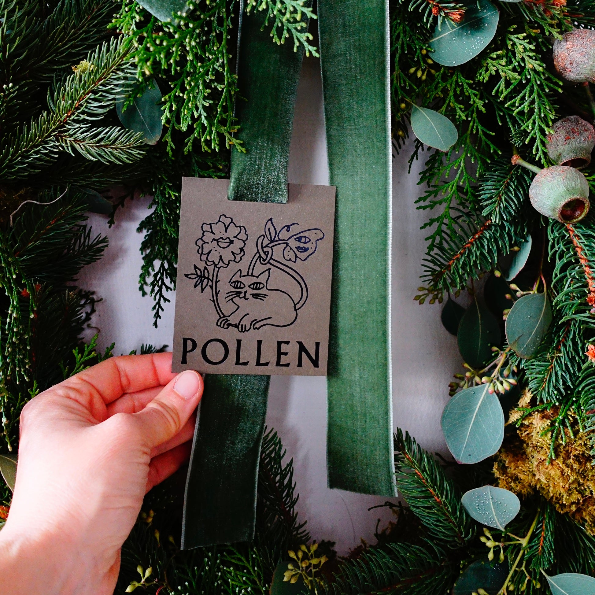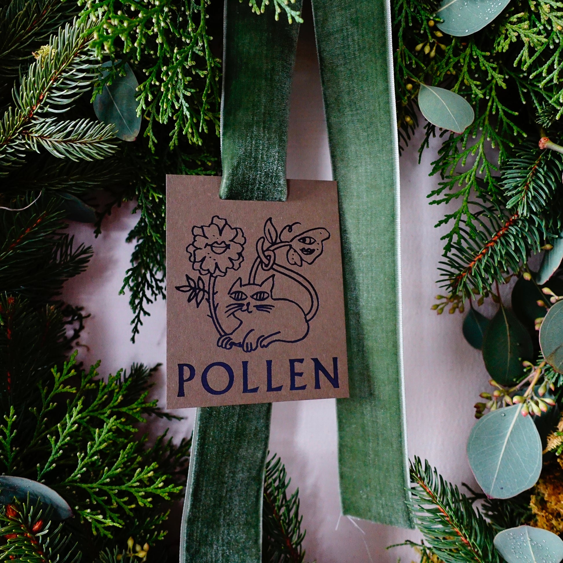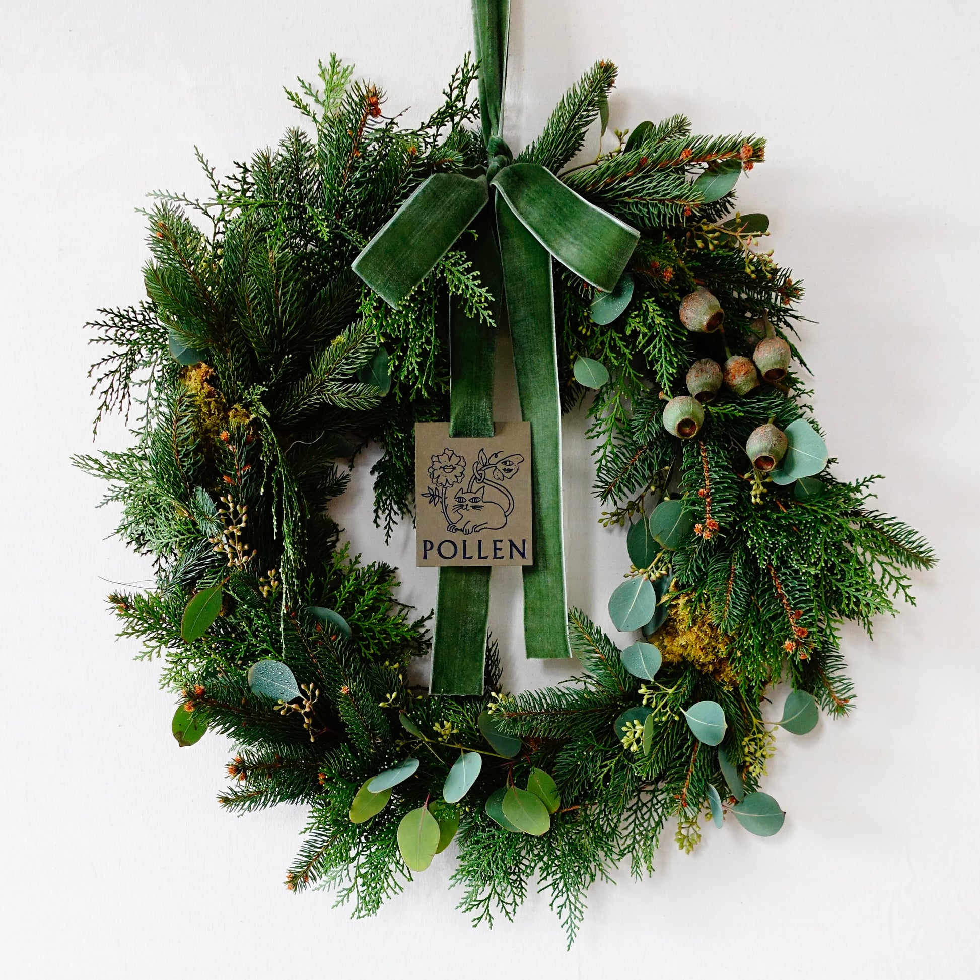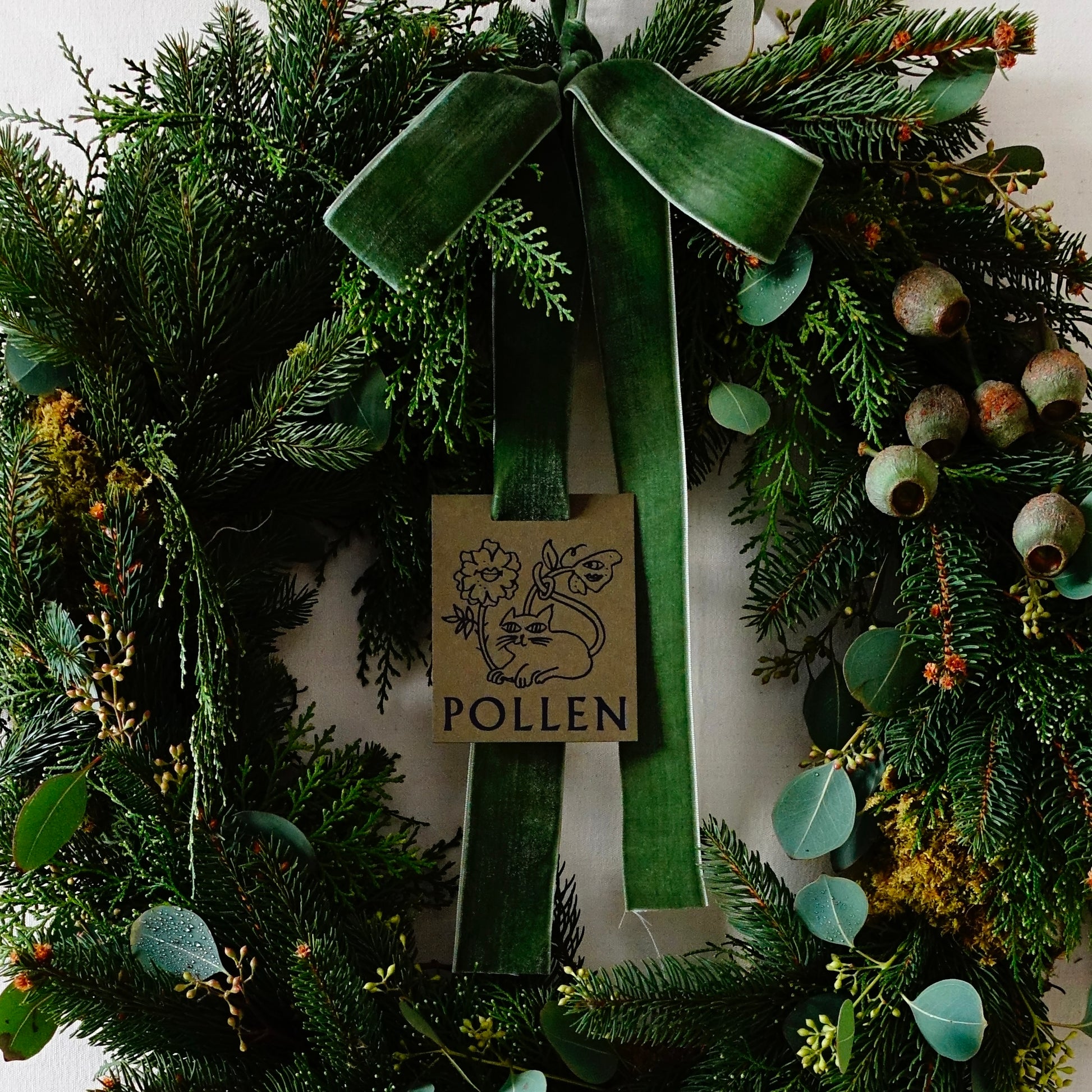 Ghirlanda di sempreverdi freschi raccolti nella nostra farm, decorata con un elegante nastro in velluto verde e il POLLEN signature hangtag.